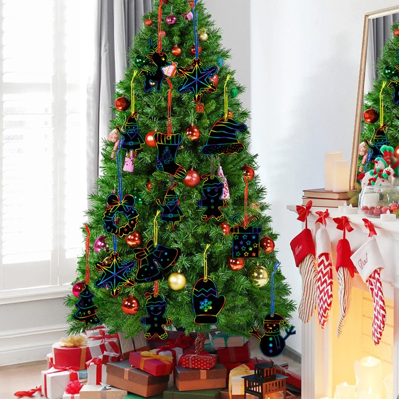 - 【Easy to Use】 Just choose the scratch painting you like, use your imagination, and then gently scratch out the pattern with a wooden stick to reveal the gorgeous rainbow colors below! Each piece of scraping paper has pre-drilled holes, which can be hung with ribbons wherever you want to decorate Christmas.