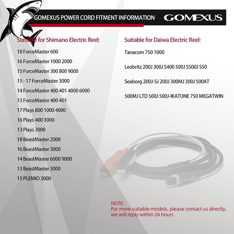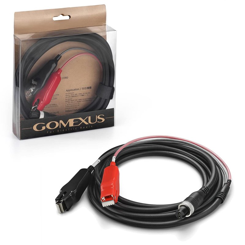 Gomexus Power Cable designed for Daiwa Seaborg Leobritz Tanacom and Shimano ForceMaster BeastMaster Plemio Plays Electric Reels.The power cord features Alligator clip battery connectors.
