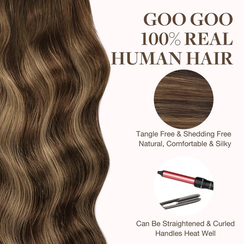 GOO GOO ombre tape in hair extensions, real remy hair material without any mixed, handmade balayage ombre hair color, match your hair perfectly. Seamless hair with strongest tape, give you beautiful hair.Tape hair extensions specification: Hair material: 100% real human hair, very soft and smooth, natural looking. Tape style: skin weft tape hair extensions, super soft tape, can be replaced. Balayage ombre hair color: combined with fashion balayage hair, can be dyed, bring you a natural looking.Tape hair extensions package: 20pcs tape hair sets, 1-2 packs for thick hair, 2-3 packs for thin hair.Hair texture: straight, can be curled to beautiful hairstyle.Hair Care MethodAbout Style: Remy tape hair extensions are just like your own hair and can be styled, curled or straightened as desired.About color: Balayage ombre color can be dyed. We don't suggest double dyeing process, because unprofessional dyeing process would affect the lifespan of tape in hair extensions. We recommend getting them colored by a professional and experienced hair colorist. We would advise for a one small piece to be tested prior to coloring the full set to make sure the resulting shade is what you anticipate..About wash: wash your hair by hold gently, do not rub your hair. Everyday wash is not good for your extensions, especially when you first apply the hair. Never use any products containing alcohol or ethanol which can damage the hair extensions and also wear down on the adhesive. Use sulfate free conditioner as well as 100% natural hair products to wash and keep hair extensions in good condition.