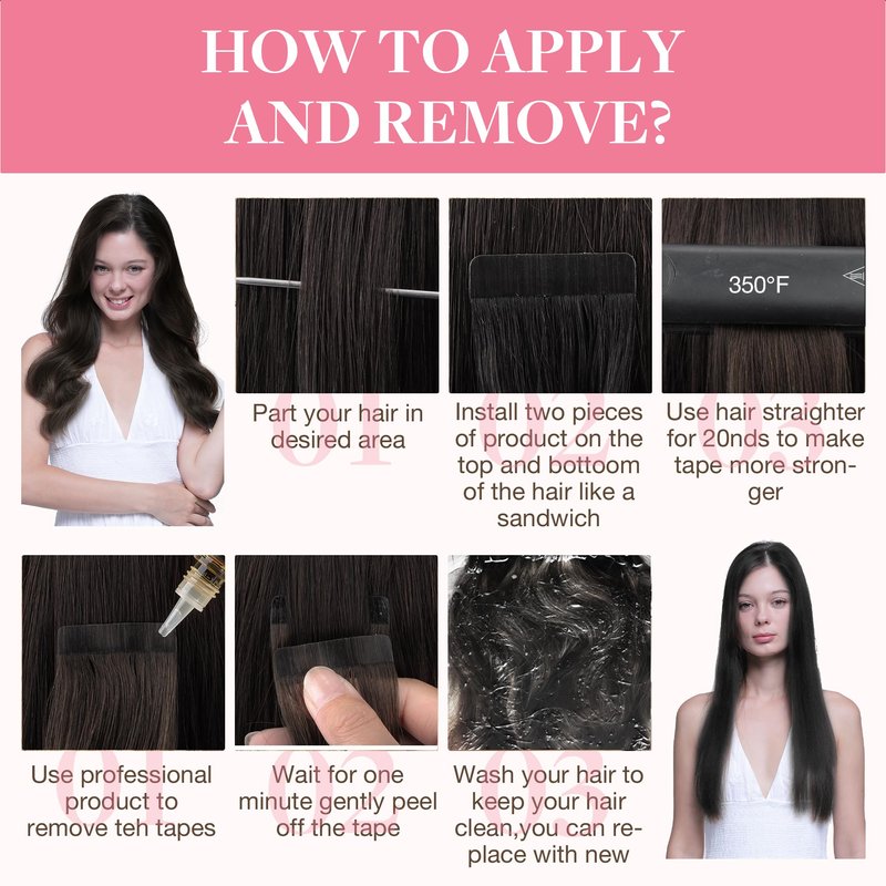 - High-Strength Tapes & Easy to Take Out-- Specially developed high-strength invisible tape. You can refer to our product page to take out the tapes. Tape in hair extensions specification: 1.5inch width, 20 Pieces, 50g Per Package. Recommend 2-3 sets for thick full head. 10-26inch available.