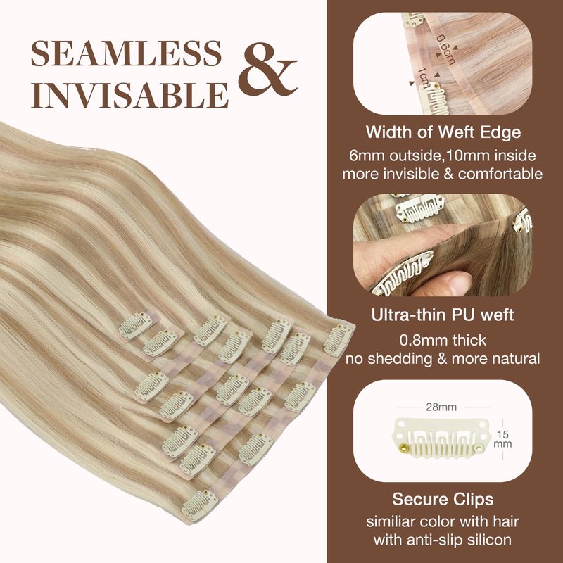 - High-Quality Clips for Quick Wear: Our clip in extensions boast slim, silicone-backed clips for a barely-there feel, securely stitched and cushioned with gentle rubber to safeguard your scalp and hair. The PU design makes the seamless clip in hair extensions more invisible, comfortable, natural, and lighter. They're a breeze to self-apply and remove, perfect for effortlessly transforming your look for any event, from weddings to parties to date nights.