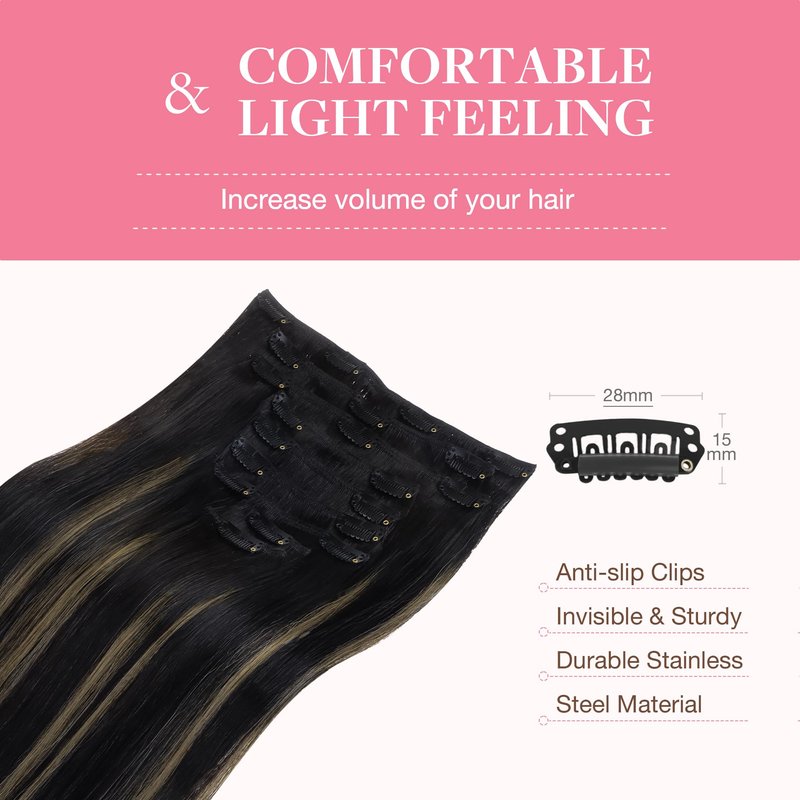 - High-Quality Clips for Quick Wear: Our clip in extensions boast slim, silicone-backed clips for a barely-there feel, securely stitched and cushioned with gentle rubber to safeguard your scalp and hair. The PU design makes the seamless clip in hair extensions more invisible, comfortable, natural, and lighter. They're a breeze to self-apply and remove, perfect for effortlessly transforming your look for any event, from weddings to parties to date nights.