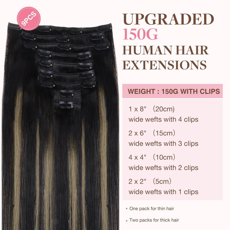 - Clip In Hair Extensions Specification: GOO GOO seamless clip-in hair extensions with PU are available in 110g, 130g, 151g, 160g; clip-in extensions are offered in weights of 120g and 150g for selection. Perfect for a natural thickness boost with 1-2 sets, or achieve a full, voluminous look with 2-3 sets. Ideal for adding both length and volume. Plus, 2 additional replacement clips for your convenience.