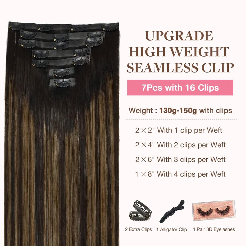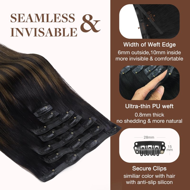 - High-Quality Clips for Quick Wear: Our clip in extensions boast slim, silicone-backed clips for a barely-there feel, securely stitched and cushioned with gentle rubber to safeguard your scalp and hair. The PU design makes the seamless clip in hair extensions more invisible, comfortable, natural, and lighter. They're a breeze to self-apply and remove, perfect for effortlessly transforming your look for any event, from weddings to parties to date nights.