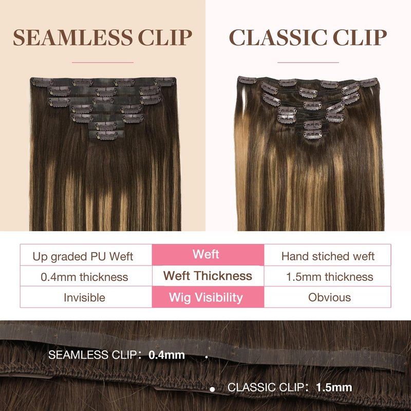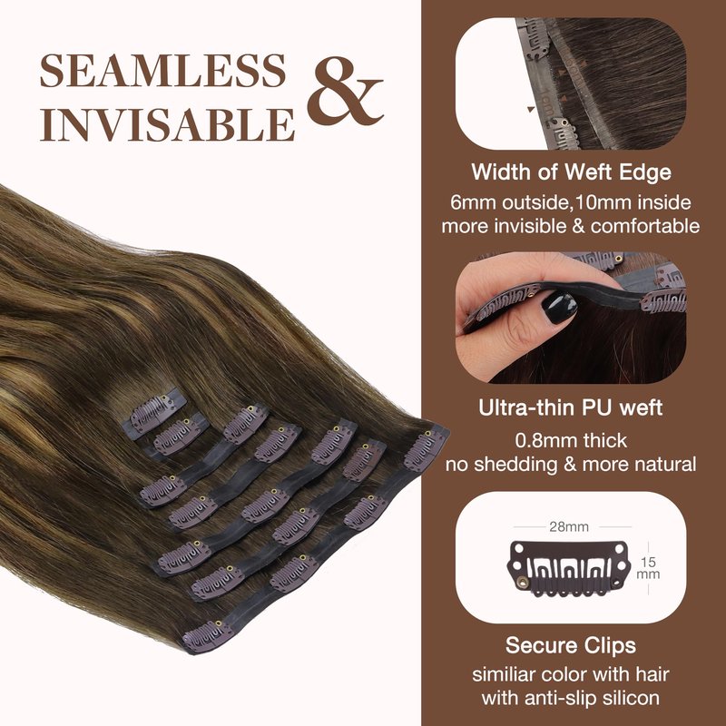 - High-Quality Clips for Quick Wear: Our clip in extensions boast slim, silicone-backed clips for a barely-there feel, securely stitched and cushioned with gentle rubber to safeguard your scalp and hair. The PU design makes the seamless clip in hair extensions more invisible, comfortable, natural, and lighter. They're a breeze to self-apply and remove, perfect for effortlessly transforming your look for any event, from weddings to parties to date nights.