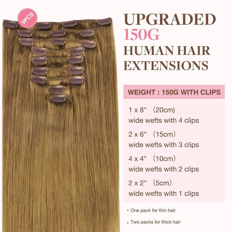 - Clip In Hair Extensions Specification: GOO GOO seamless clip-in hair extensions with PU are available in 110g, 130g, 150g; clip-in extensions are offered in weights of 120g and 150g for selection. Perfect for a natural thickness boost with 1-2 sets, or achieve a full, voluminous look with 2-3 sets. Ideal for adding both length and volume. Plus, 2 additional replacement clips for your convenience.