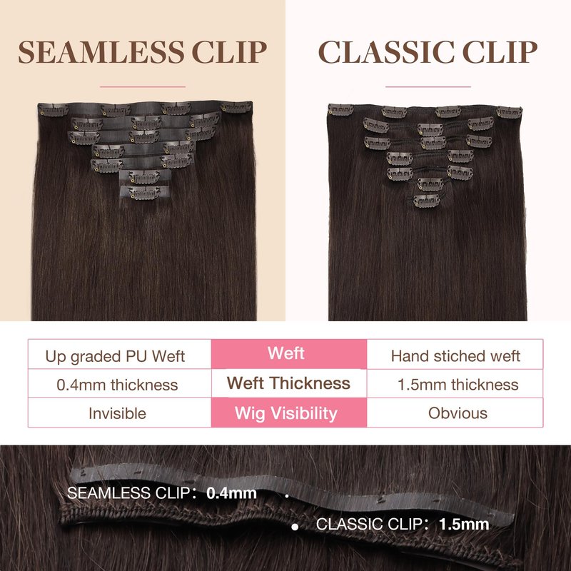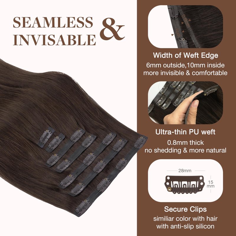 - High-Quality Clips for Quick Wear: Our clip in extensions boast slim, silicone-backed clips for a barely-there feel, securely stitched and cushioned with gentle rubber to safeguard your scalp and hair. The PU design makes the seamless clip in hair extensions more invisible, comfortable, natural, and lighter. They're a breeze to self-apply and remove, perfect for effortlessly transforming your look for any event, from weddings to parties to date nights.