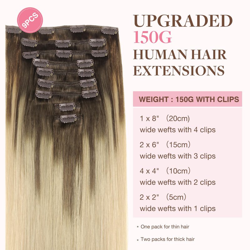 - Clip In Hair Extensions Specification: GOO GOO seamless clip-in hair extensions with PU are available in 110g, 130g, 150g; clip-in extensions are offered in weights of 120g and 150g for selection. Perfect for a natural thickness boost with 1-2 sets, or achieve a full, voluminous look with 2-3 sets. Ideal for adding both length and volume. Plus, 2 additional replacement clips for your convenience.