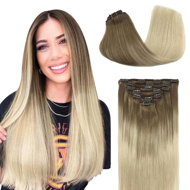GOO GOO Clip in Hair Extensions Real Human Hair, 22inch, 9/60 Balayage Ash Brown to Platinum Blonde, Remy Human Hair Extensions Clip ins for Women, Soft & Natural Human Hair