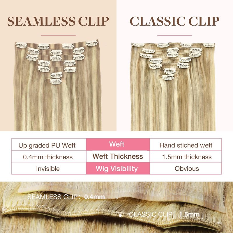 - High-Quality Clips for Quick Wear: Our clip in extensions boast slim, silicone-backed clips for a barely-there feel, securely stitched and cushioned with gentle rubber to safeguard your scalp and hair. The PU design makes the seamless clip in hair extensions more invisible, comfortable, natural, and lighter. They're a breeze to self-apply and remove, perfect for effortlessly transforming your look for any event, from weddings to parties to date nights.