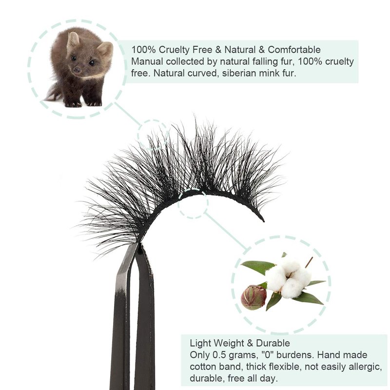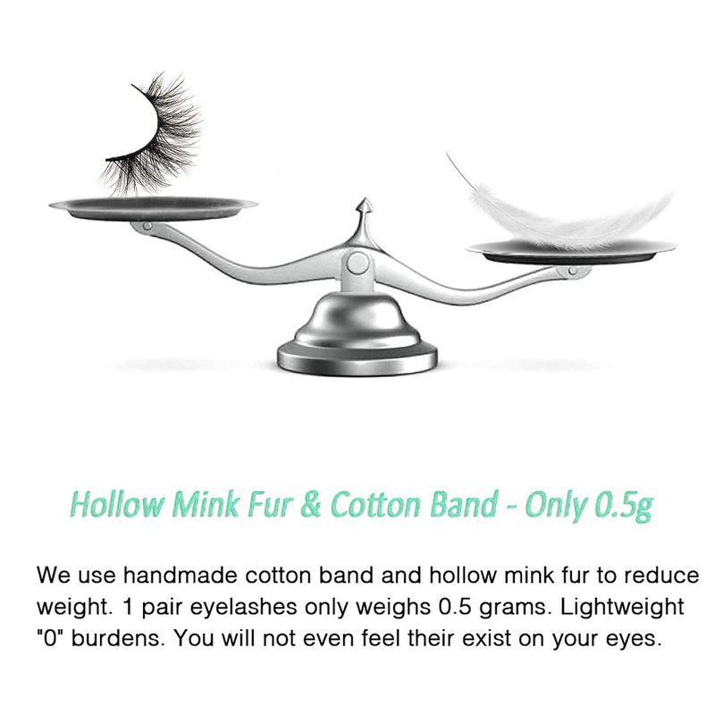 - 4.【Only 0.5g - Light Weight】-- Each pair of mink eyelashes only weigh 0.5 grams. Lightweight "0" burdens. Cruelty-free Mink fur. These fine fibers come from the tails of artificial breeding minks' natural falling hair and are sanitized and dyed before they're packaged as easy-to-install eyelashes.