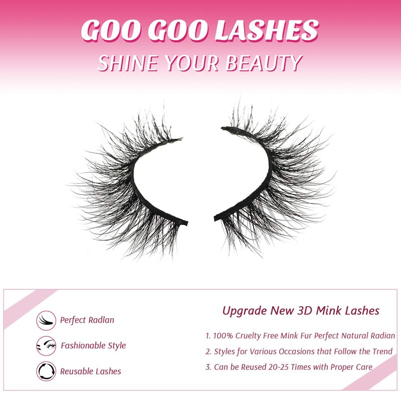 GOO GOO 3D mink eyelashes team design more fashion natural soft false eyelashes for beauty girl/women to choose. Wish to give our customer beautiful and charming looking every day.Product descriptionMaterial: 100% siberian mink fur. full strip mink lashes, vivid and soft.Use times: Can be reused 20-25 times with good care. Always handle the lash from the band avoiding grabbing the lash fibers. Suitable place: This lashes style is perfect for make up wear, professional application like Wedding Event & Photo shoot & dating night or a girls night & graduation & birthday party.Package: 3 pairs of strip mink lashes give you more experience.How to use and remove: Ues the eyelashes:1. Remove the false eyelashes, and trim it to fit your eye length.2. Use both hands to adjust the false eyelashes to fit your eye curve.3. Carefully apply the glue to the main stem of the false eyelashes.4. Wait a few minutes for the glue to dry until the glue is almost transparent. This is the ideal time to apply lashes to eyelids.5. Close the eyes as appropriate and ensure a proper fit by blinking. 6. See the perfect and shining eyes.Remove the eyelashes:Dip in with cotton buds in discharge makeup fluid, in false eyelash glue it wiped gently let loose, false eyelash will gently remove eyelash from eye end, to remove eyelash glue, fingers will pave eyelash, put it in a box.