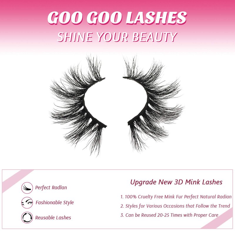 GOO GOO 3D mink eyelashes team design more fashion natural soft false eyelashes for beauty girl/women to choose. Wish to give our customer beautiful and charming looking every day.Product descriptionMaterial: 100% siberian mink fur. full strip mink lashes, vivid and soft.Use times: Can be reused 20-25 times with good care. Always handle the lash from the band avoiding grabbing the lash fibers. Suitable place: This lashes style is perfect for make up wear, professional application like Wedding Event & Photo shoot & dating night or a girls night & graduation & birthday party.Package: 3 pairs of strip mink lashes give you more experience.How to use and remove: Ues the eyelashes:1. Remove the false eyelashes, and trim it to fit your eye length.2. Use both hands to adjust the false eyelashes to fit your eye curve.3. Carefully apply the glue to the main stem of the false eyelashes.4. Wait a few minutes for the glue to dry until the glue is almost transparent. This is the ideal time to apply lashes to eyelids.5. Close the eyes as appropriate and ensure a proper fit by blinking. 6. See the perfect and shining eyes.Remove the eyelashes:Dip in with cotton buds in discharge makeup fluid, in false eyelash glue it wiped gently let loose, false eyelash will gently remove eyelash from eye end, to remove eyelash glue, fingers will pave eyelash, put it in a box.