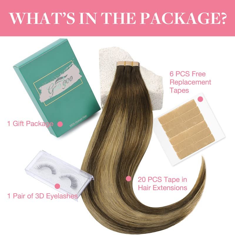 GOO GOO Tape in Hair Extensions Chocolate Brown to Caramel Blonde Real Human Hair Extensions Seamless Straight Human Hair Extensions 50g 20pcs 14inch