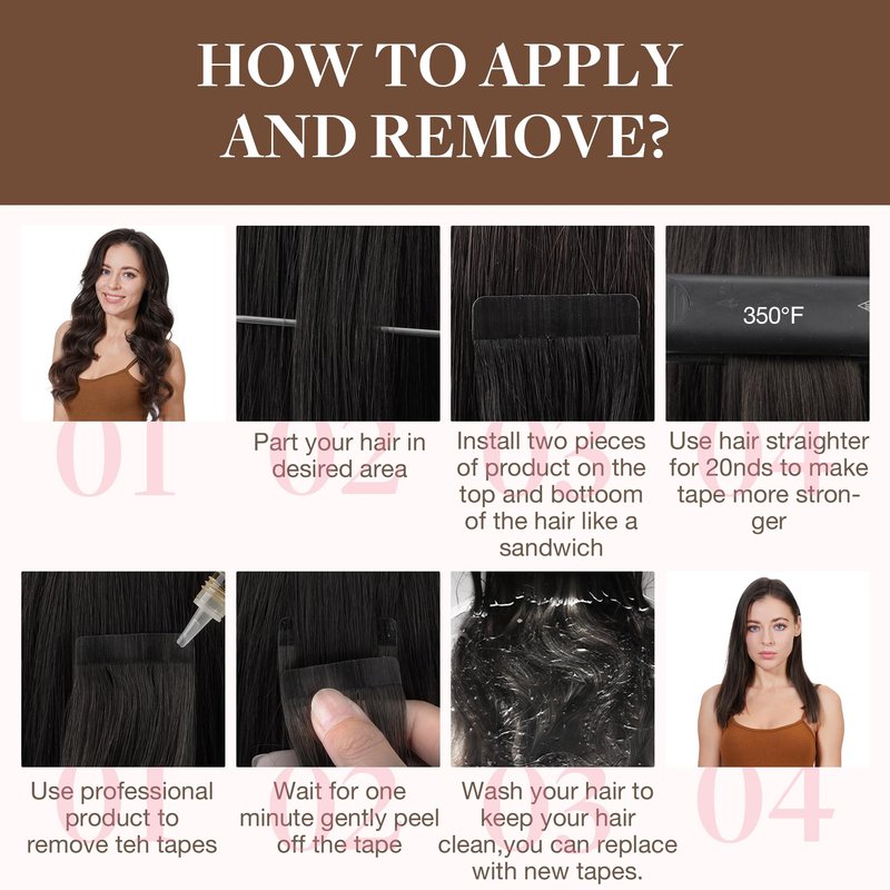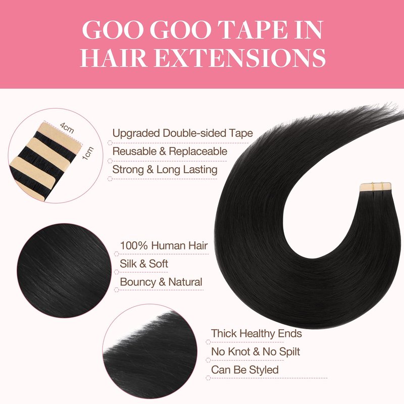 GOO GOO Tape in Hair Extensions Human Hair, 1 Jet Black, 10inch 20pcs 30g, Silky Straight, Thick Ends, Natural-Looking, Double-Sided Tape in