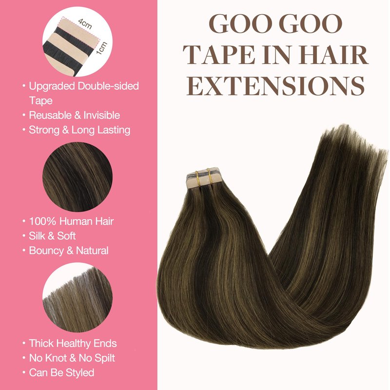 - Strong & Invisible Tape: GOO GOO hair extensions feature specially developed high-strength invisible tape that is hypoallergenic, durable, and not easy to fall off. The tape lasts up to 4-6 weeks and can be replaced as needed. It's lightweight and comfortable, without pressure, easy to install and remove, perfectly attached to your scalp without any discomfort.
