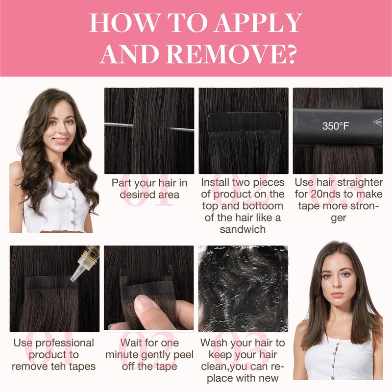 GOO GOO ombre tape in hair extensions, real remy hair material without any mixed, handmade balayage ombre hair color, match your hair perfectly. Seamless hair with strongest tape, give you beautiful hair.Tape hair extensions specification: Hair material: 100% real human hair, very soft and smooth, natural looking. Tape style: skin weft tape hair extensions, super soft tape, can be replaced. Balayage ombre hair color: combined with fashion balayage hair, can be dyed, bring you a natural looking.Tape hair extensions package: 20pcs tape hair sets, 1-2 packs for thick hair, 2-3 packs for thin hair.Hair texture: straight, can be curled to beautiful hairstyle.Hair Care MethodAbout Style: Remy tape hair extensions are just like your own hair and can be styled, curled or straightened as desired.About color: Balayage ombre color can be dyed. We don't suggest double dyeing process, because unprofessional dyeing process would affect the lifespan of tape in hair extensions. We recommend getting them colored by a professional and experienced hair colorist. We would advise for a one small piece to be tested prior to coloring the full set to make sure the resulting shade is what you anticipate..About wash: wash your hair by hold gently, do not rub your hair. Everyday wash is not good for your extensions, especially when you first apply the hair. Never use any products containing alcohol or ethanol which can damage the hair extensions and also wear down on the adhesive. Use sulfate free conditioner as well as 100% natural hair products to wash and keep hair extensions in good condition.