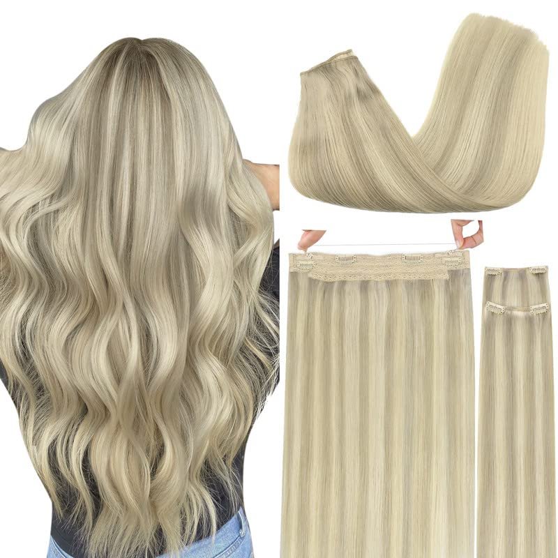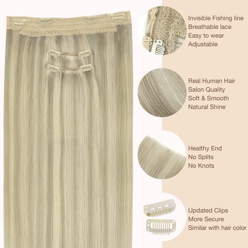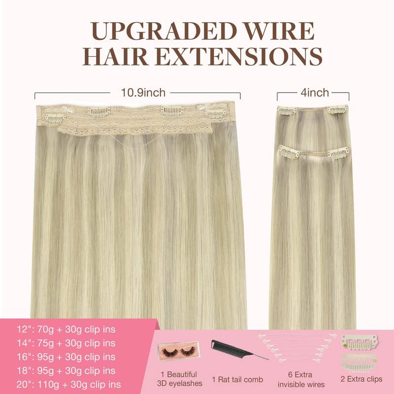 GOO GOO Wire Hair Extensions Human Hair, 17A/60A Ash Blonde mix Platinum Blonde Highlighted 20inch 140g, Invisible Wire Hair Extensions with Transparent, Seamless Fish Line Hairpiece