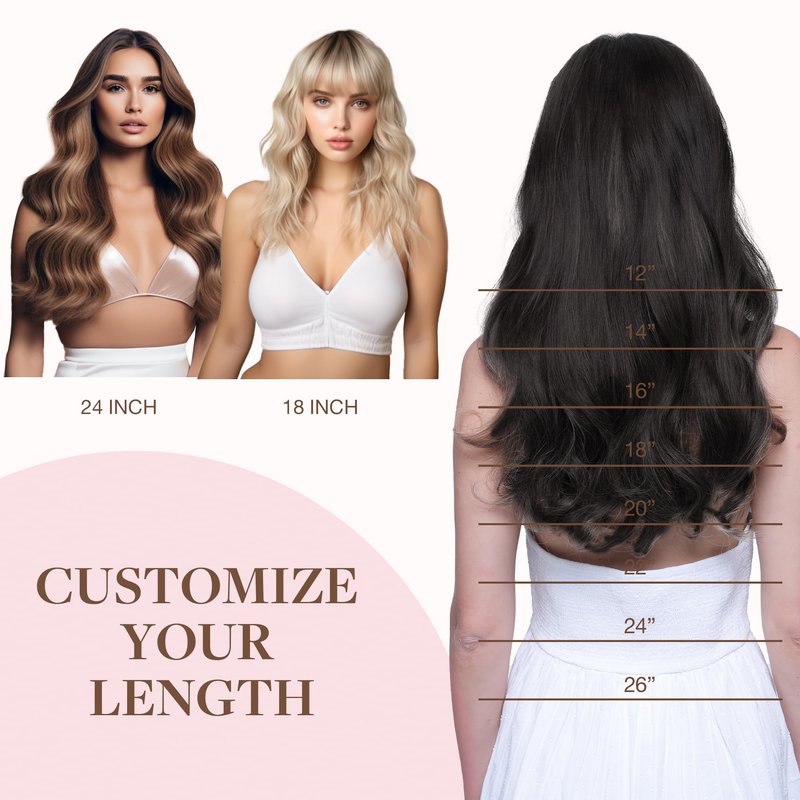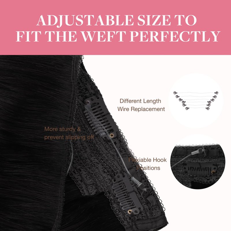Our Wire Hair Extensions Advantage:1. Instant Length and Volume: Only 5 minutes to put or take out. Wire hair extensions are the easiest and quickest way of adding volume and length ever. Don’t need to worry if you are new to hair extensions.2. Super Convenient: Just put the hair extensions on your head, and pull your hair over the miracle wire to cover the hair extensions. Comb the hair to make it blend with your hair. Then you are ready for a date.3. More Natural & healthy: no tape, no glue, better hair protection. 100% remy human hair extensions can be dyed, curled or straightened.4. More invisible: with transparent wire, can blend perfectly with your hair color.5. Adjustable Size: by adjusting the position of the hook and then you can tighten or loosen the standby wire whose length is 9.25 inch. We put 3 more wires in the package. It’s not suitable for people with very fine hair on the top or baldness as the wire may be seen.Our Wire Human Hair Extensions Specification:Hair Material: Remy human hair can be curled and dyed.Transparent Wire Hair Extensions: one piece per pack.Texture: Straight, and have a natural wave when wet or left to airdry or diffused.Size: Adjustable. Fit the extensions on your head by tightening or loosening the wire.Length: 12inch,14inch 16inch, 18inch, 20inch.Width: 10.9inch.Light Weight: 12": 70g, 14": 75g, 16"-18": 95g, 20": 110g. 1 pack is for adding length, and 2 packs are for adding volume.