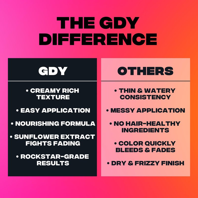 Good Dye Young’s Semi Permanent Pink Dye: Unleash your bold & spectacular style with GDY’s pink temporary hair dye! The GDY pink hair dye temporary works on all hair types & colors & is vegan and cruelty-free. Our UV hair dye combines salon-grade pigments with a nontoxic, conditioning formula that deposits ultra-vibrant color. The hair dye colors in our vegan semi permanent hair dye are deposited on top of the hair shaft and act like a stain that will fade out each time you wash your hair (lasts 15-24+ washes)! --- --- How To Use: Lighten your hair using our Lightening Kit & squeeze out some color into our Tool Kit. Wear gloves to prevent staining. Do a strand test with this UV hair dye before dividing your hair into 4 sections & applying the saturated cream all over! Let sit for 30 minutes before rinsing out with cool water. No shampoo or conditioner is required! --- How To Care: Allow at least 24 hours for hair color changing dye to set before you shampoo; reduce hair washing days to extend color & wash with cool water to minimize fading.