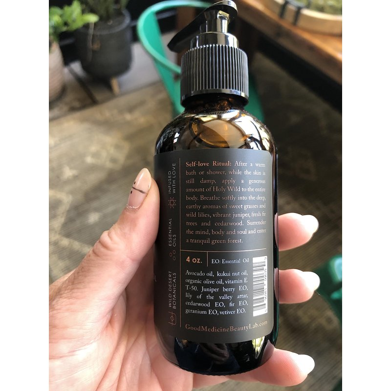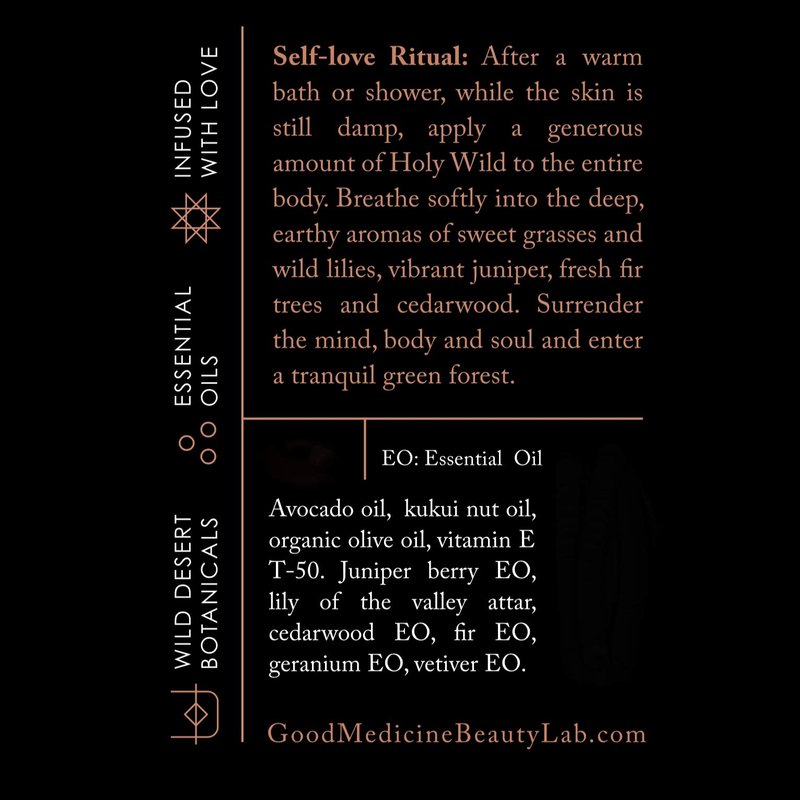 - ✔️ HOW TO USE: After a warm bath or shower, while the skin is still damp, apply a generous amount of Holy Wild to the entire body. Breathe softly into the deep, earthy aromas of sweet grasses and wild lilies, vibrant juniper, fresh fir trees and cedarwood. Surrender the mind, body and soul and enter a tranquil green forest.