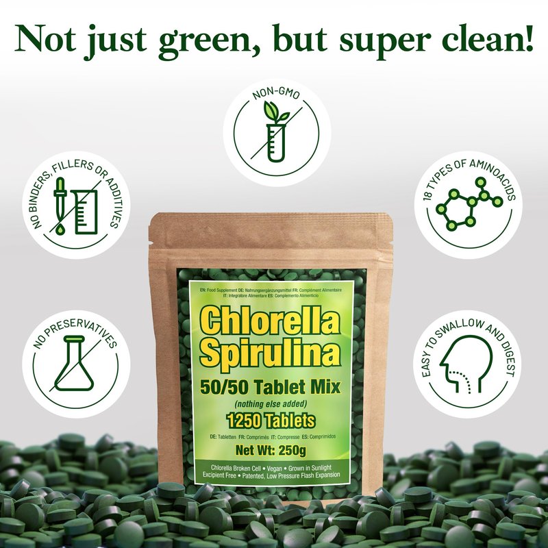 - [ 𝗘𝗮𝘀𝘆 𝘁𝗼 𝗦𝘄𝗮𝗹𝗹𝗼𝘄 & 𝗘𝗮𝘀𝗶𝗲𝗿 𝘁𝗼 𝗗𝗶𝗴𝗲𝘀𝘁 ] - We use a patented expansion technique to source our chlorella spirulina. The chlorella spirulina tablets’ cracked cell wall technology increases the digestive rate to up to 80% while maintaining 100% of the nutritional value