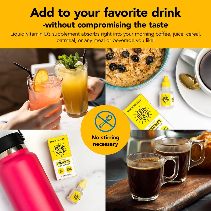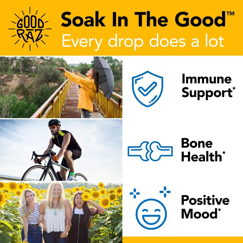 Something so good (vitamin D3) shouldn’t taste so...bad! That’s why Good Rāz Vitamin D3 is undetectable when added to your favorite drink. Just add two drops & voila! Good Rāz Vitamin D3 Drops can be added to any of your favorite drinks and foods–coffee, tea, cereal, yogurt, even water! Taking daily vitamins should be super quick and easy. Simply toss in two drops and enjoy. All of the benefits of vitamin D3 with none of the nose-holding of vitamins or oil-based liquids. We believe the secret to wellness lies in the small things we do every day and we strive to make those small steps (or drops!) even easier. Good Rāz water-soluble Vitamin D3 Drops make getting your daily dose of sunshine nothing but a breeze. No stirring necessary. Water-soluble D3 absorbs quickly in the body so it can provide maximum benefits. Vitamin D is essential for calcium and phosphate absorption, which helps build and maintain strong bones. The sunshine vitamin supports the immune system and overall health, making your days feel brighter.