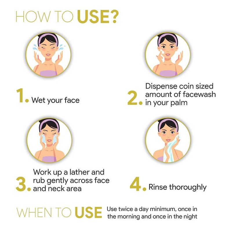 - HOW TO USE: Take out the required amount of Face Wash. On a damp face, massage it gently. Rinse with water and pat dry.