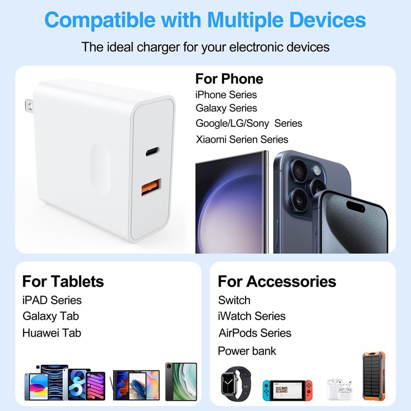 - Wide Compatibility: This wall charger is compatible with lots of devices, including power banks, iPhones, Android phones, tablets, headphones, game consoles, etc. In addition to the charger, the set also comes with a USB-C to IOS cable, so there is no need to buy an additional cable.