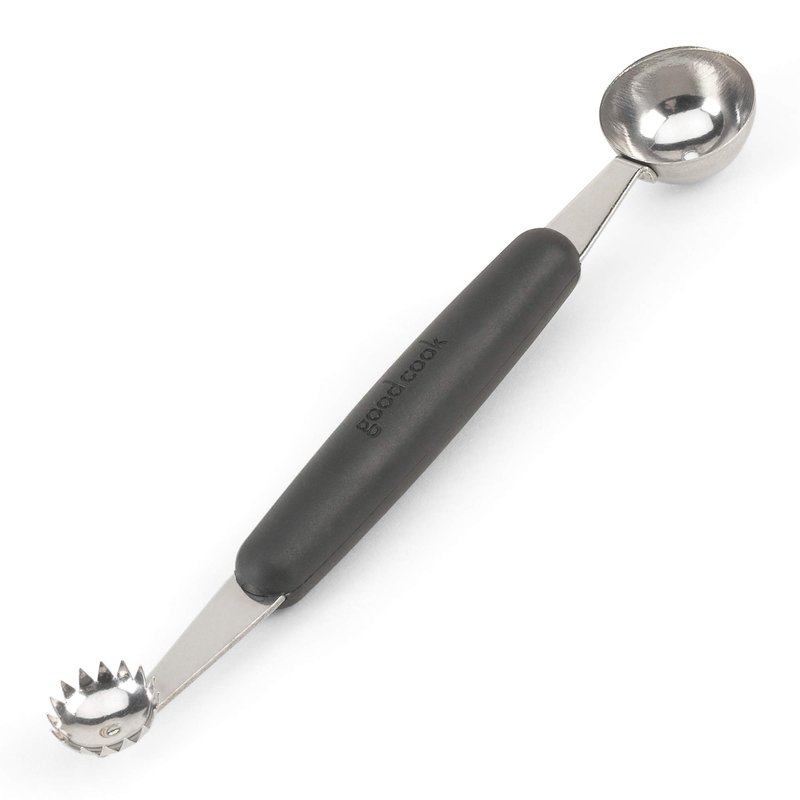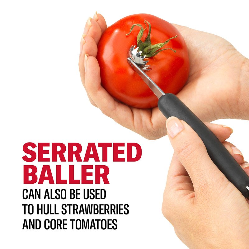 - 2-IN-1 BALLER AND HULLER GADGET: Designed with 2 sturdy stainless steel scooping ends including a larger scoop with a smooth, straight rim and a smaller scoop with sharp serrated teeth