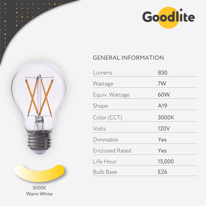 Goodlite G-83445 7W A19 Led Light Bulb, 60W Equivalent 850 Lumens E26 Base 3000K Warm White Dimmable Clear