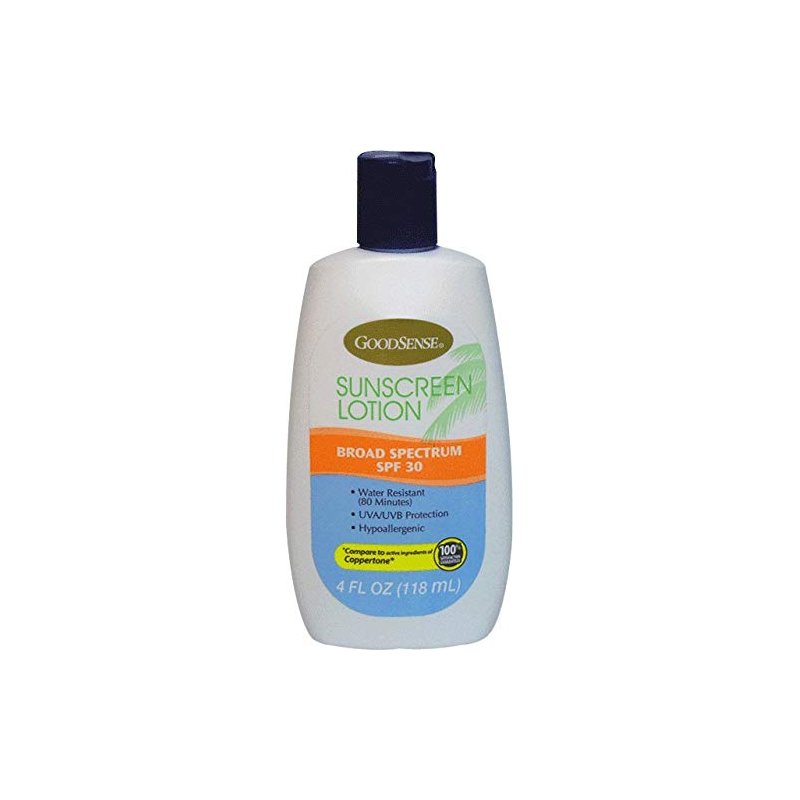 GoodSense(R) Sunscreen Lotion - Broad Spectrum SPF 30Water Resistant (80 minutes) - UVA/UVB protection - Hypoallergenic.4 oz. (118 mL)Avobenzone, Homosalate, Octisalate, Octocrylene