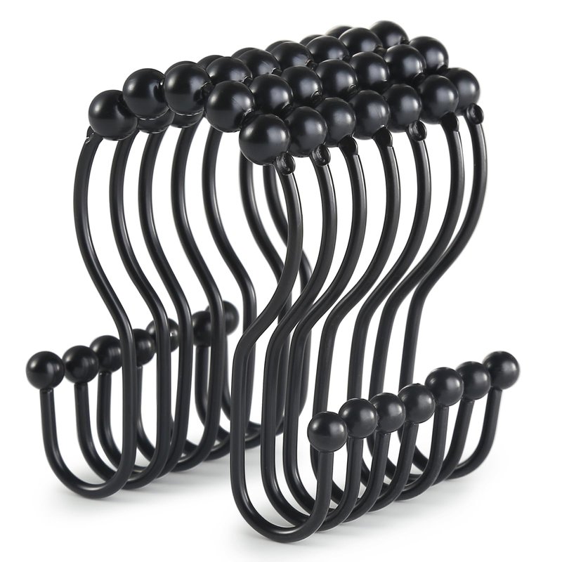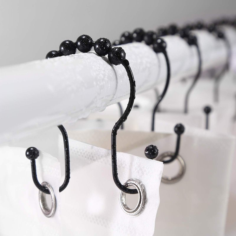 - [DOUBLE SHOWER HOOKS]: The black shower curtain hooks are made by exquisite craft. The obstacle on both sides fix the rollwer balls to keep balance, which prevent shower curtain from falling off, it's strong enough to hold both heavy curtain and liner.