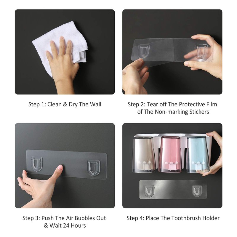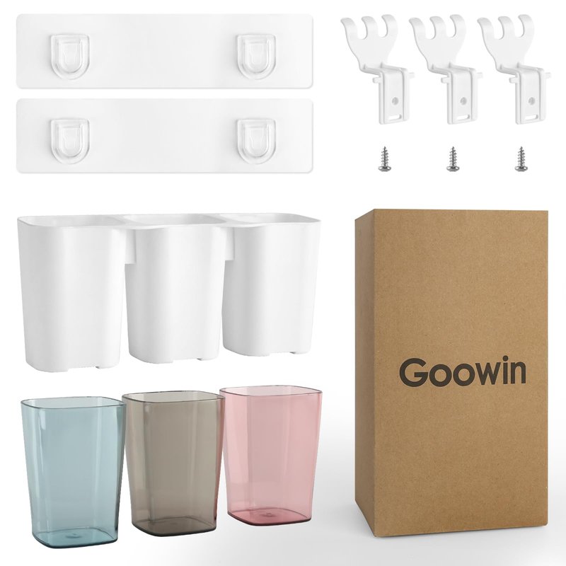 Goowin Toothbrush Holder Product Specifications: Material: PP + PS Net Weight: 16.58 oz/set Package Includes: 1 toothbrush holder + 1 magic sticker + 3 candy-colored cups Features: 1. Eco-friendly & safe material, no-toxic, odorless and BPA free. 2. Hollowed out design bottom, inverted rinse cup, safe & sanitary. 3. Convenient to store toiletries, refuse messy. 4. Hold up to 11 LB, meet the needs of daily life & without falling off. 5. No need to drill, complete the installation in seconds. 6. Thickened material, waterproof, sturdy & durable. Choosing Goowin toothbrush holder for bathroom to keep the bathroom tidy, healthy and hygienic, making your family have a good mood in the morning & evening during brushing! The Correct Installation Way Makes The Toothbrush Holder W all Mounted Work Better & Last Longer Step 1: Clean & Dry The Wall Step 2: Tear off The Protective Film of The Non-marking Stickers Step 3: Push The Air Bubbles Out & Wait 24 Hours Step 4: Place The mighty Toothbrush Holders Use tips: 1. Please remember to CLEAN & DRY the wall before installing, which will affect the viscosity of the magic sticker. 2. After stick on the wall, please squeeze the air out and stand for 24 hours, which will decide the service life of the shower toothbrush holder . 3. For the toothbrush wall holder to work better, please don't install it on rough or easy-to-fall walls, such as cement, lime or wallpaper.