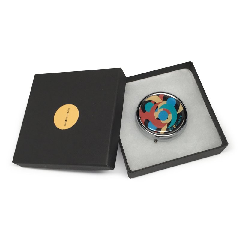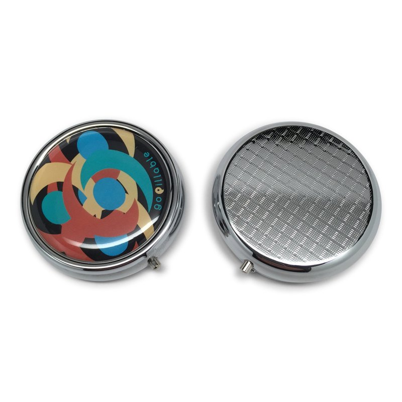 - *GOPILLABLE ROUND, METAL PILLCASE - decorative, designer, cute pill box container with decorative design colored lid, perfect for discrete daily carry with raised pattern on back.