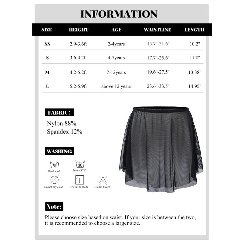 - 【Girls Toddler Dance Skirt Size】XS(height: 2.95-3.6ft, waist: 15.7-21.6'', skirt length:10.2''), S (height:3.6-4.26ft Waist: 17.7-25.6'', skirt length: 11.8''), M (Height:4.2-5.2ft, Waist: 19.6-27.5'', skirt length:13.38''), L(Height:5.2-5.9ft ,Waist: 23.6-33.5'', skirt length:14.95'')