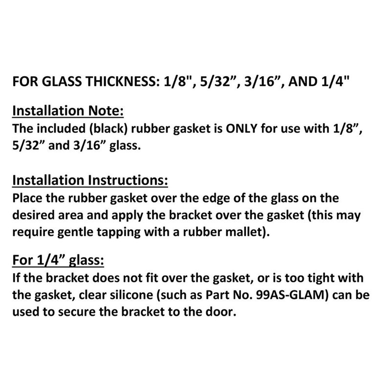 For all other glass thicknesses: if the bracket does not fit over the gasket, or is too tight with the gasket, clear silicone (such as Part No. 99AS-GLAM) can be used to secure the bracket to the door.