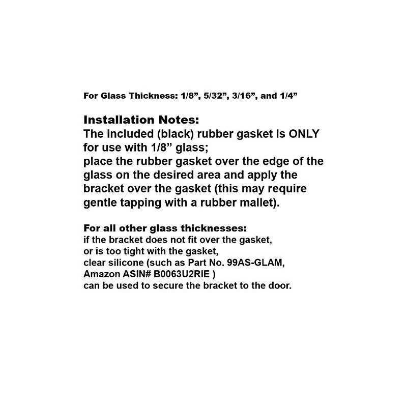 For Retrofit or New Installation No Glass Fabrication Required 3" Frameless Shower Door Handle with Metal Strike and Magnet, for use with glass thickness 1/8", 5/32", 3/16", and 1/4". Set includes: Shower Door Handle with Stainless Steel Strike insert, Magnet and glazing vinyl. Color: Brushed Nickel Handle Size: 3 in Magnet Size: 3 in. Installation Instructions: The included (black) rubber gasket is ONLY for use with 1/8” glass; place the rubber gasket over the edge of the glass on the desired area and apply the handle over the gasket (this may require gentle tapping with a rubber mallet). For all other glass thicknesses: if the handle does not fit over the gasket, or is too tight with the gasket, clear silicone (such as Part No. 99AS-GLAM) can be used to secure the handle to the door.