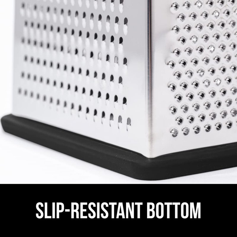 - STAINLESS STEEL CONSTRUCTION: the sharp, high quality stainless steel blades on all 4 sides of the grater help grate, shred, zest and slice your foods quicker than ever; rust resistant and dishwasher safe for long lasting use
