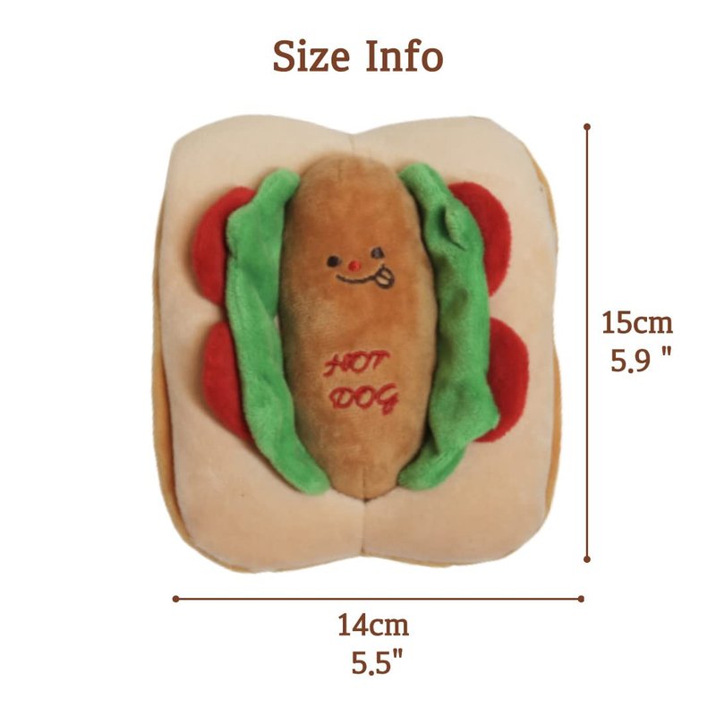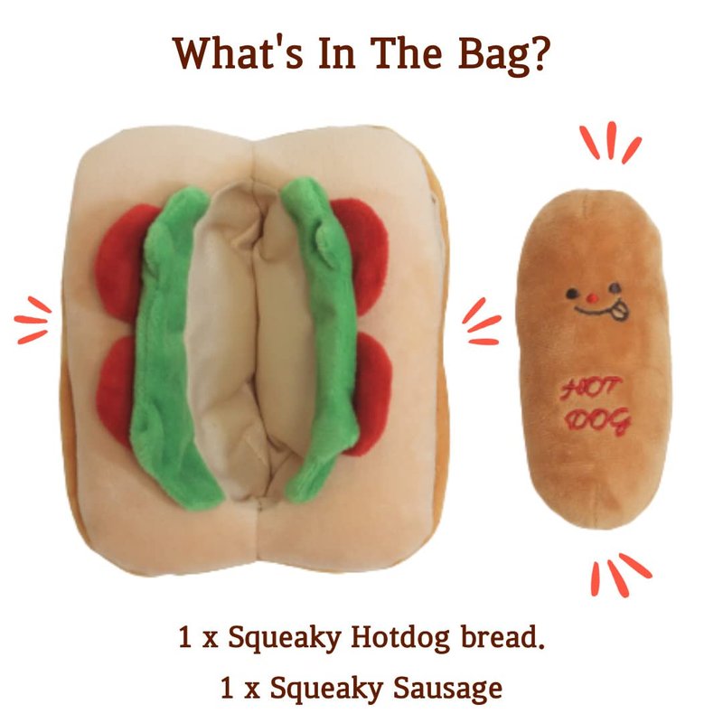 - Squeaky & Crinkle Dog Toy : This squeaky dog toy is a must-have for your dog. Hot dog with multiple squeakers. Two squeakers in the sausage, two squeakers in the buns. Lettuce and tomato make a crinkle sound, designed to make your dog excited and eager to play.