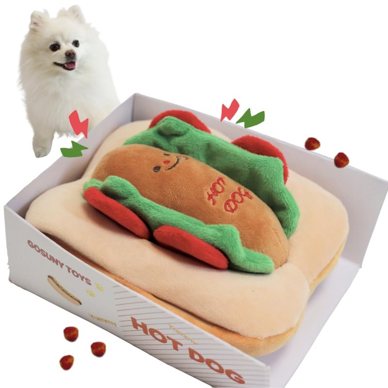 - Dog Snuffle Toy for Hiding Treats : There are four snack pockets on the side of the hot dog buns. The Sausages can be put in and taken out of hot dog buns. You can also take out the sausage and put some treats in it. While dogs play hide and seek with these squeaky toys, they are using their problem solving skills and focusing their energy into something positive, playful, and fun.