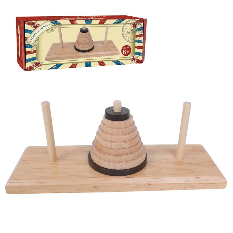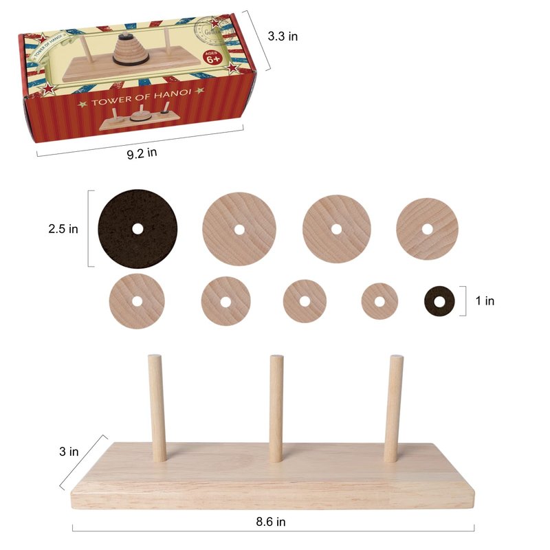 The Hanoi Tower (9 rings) also called Lucas Tower, the mathematical game puzzle that encloses with three rods and disk rings of different sizes from bigger to smallest in order. A player needs to slide disks and move to another rod, which starts from moving an upper disk from the smallest disk on the top to other stacks or an empty rod. But the player needs to obey the rules following;- one disk can move at the time- larger disk cannot place on top of the smaller disk. That simple rules that player may take many moved for Hanoi Tower 9 rings, but for the beginners, they start from three disks for the easy part to make understanding how to play the game puzzle. Setup: The base placed horizontally; the rods stand upright in the holes in the surface. Then, the nine disks are stacked in decreasing order from base to summit; this creates the Tower. Product name: The Hanoi Tower. Material: Wood. Color: Natural and brown. Size: 8.6x3.1x3 inch. Number of rings: 9 rings.