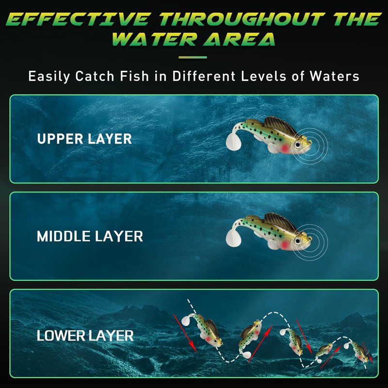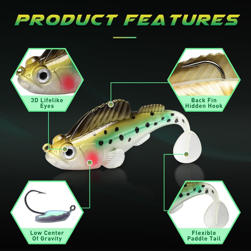 - LOW CENTER OF GRAVITY WEIGHT - The weedless fishing lure is equipped with a low center of gravity weight, which allows the lure to deliver a stealthy while lifelike presentation as a bottom bouncing swimbait. The swimbait lures with an internal jig head ensures long casting and slow sinking.