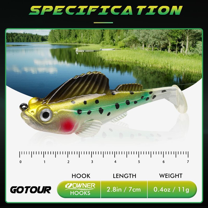 - LIFE-LIKE SWIMMING ACTION - GOTOUR bass lures are equipped with 3D paddle tail, life-like holographic eyes, and solid wire. The bass fishing lure shows perfect kicking action no matter at slow speed or fast speed, resulting in a highly attractive swimming action.