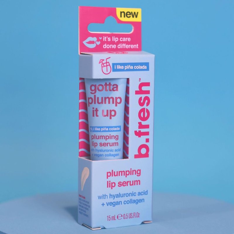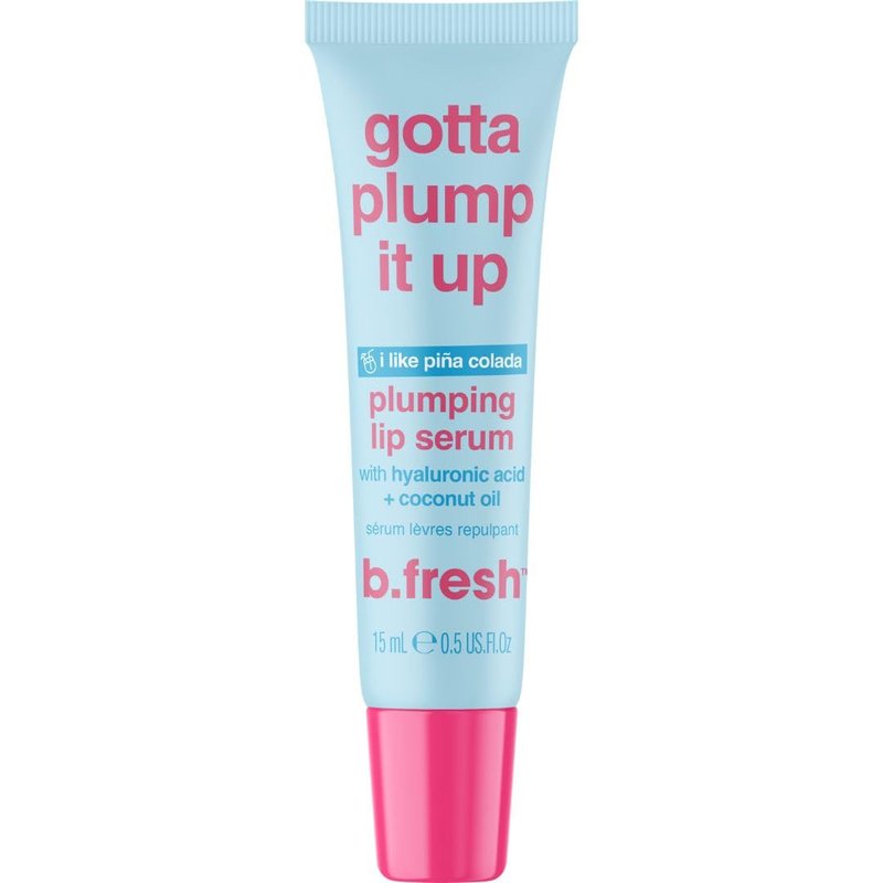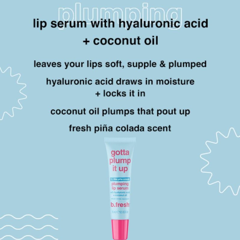 look no further for a smooch-worthy plumped up pout? look no further than our plumping lip serum enriched with plant-derived hyaluronic acid and coconut oil. hyaluronic acid draws moisture in to your lips & locks it in for plumped, soft, pillowy lips while the fatty acids from coconut oil helps to deeply moisturize + soften your lips for the most supple lips out. the piña colada flavor will have those lips feelin' all fresh & delicious like a tropical cocktail.