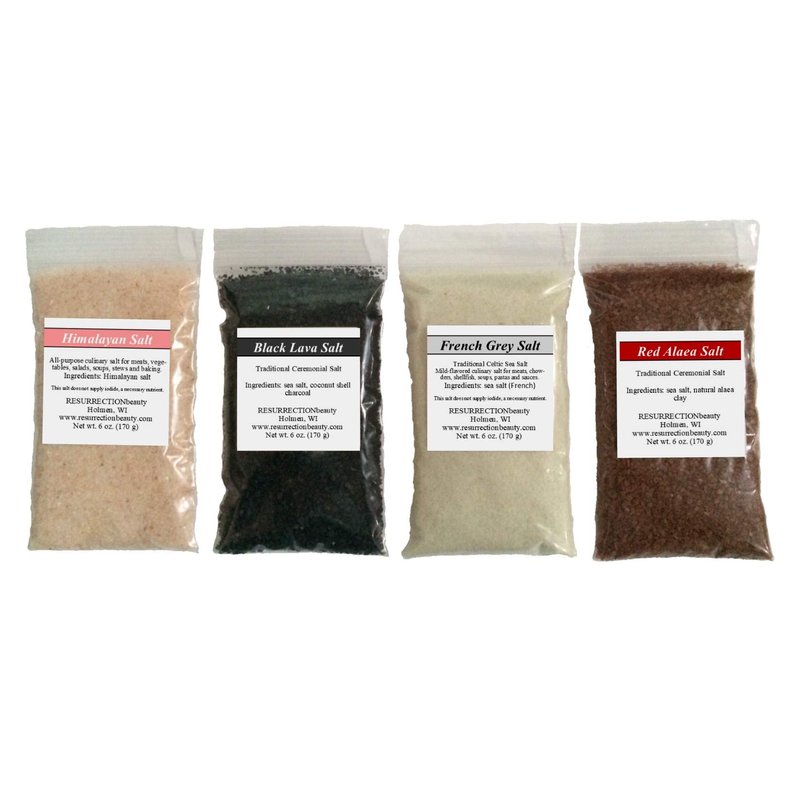 Beautiful sampler of four (6 oz. each) sea salts from around the world! Two are extra fine salts (Himalayan and French Grey) and two are coarse traditional ceremonial salts (Hawaiian Red Alaea and Black Lava). Total weight, 24oz. Note: French Grey may come in fine or coarse. The coarse French Grey may contain moisture and this is normal for this kind of salt.