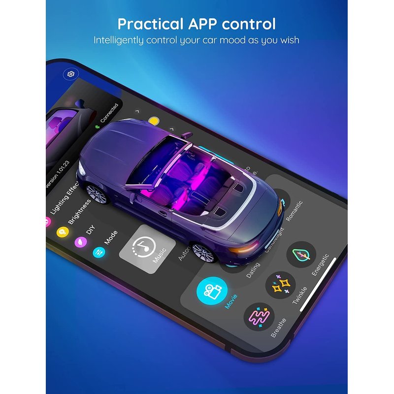 - Dynamic Music Mode: Built-in mic helps interior car lights sync with any music type. Liven up your road trips, weekend getaways or evening commute with colors that dance vibrantly to your favorite songs.