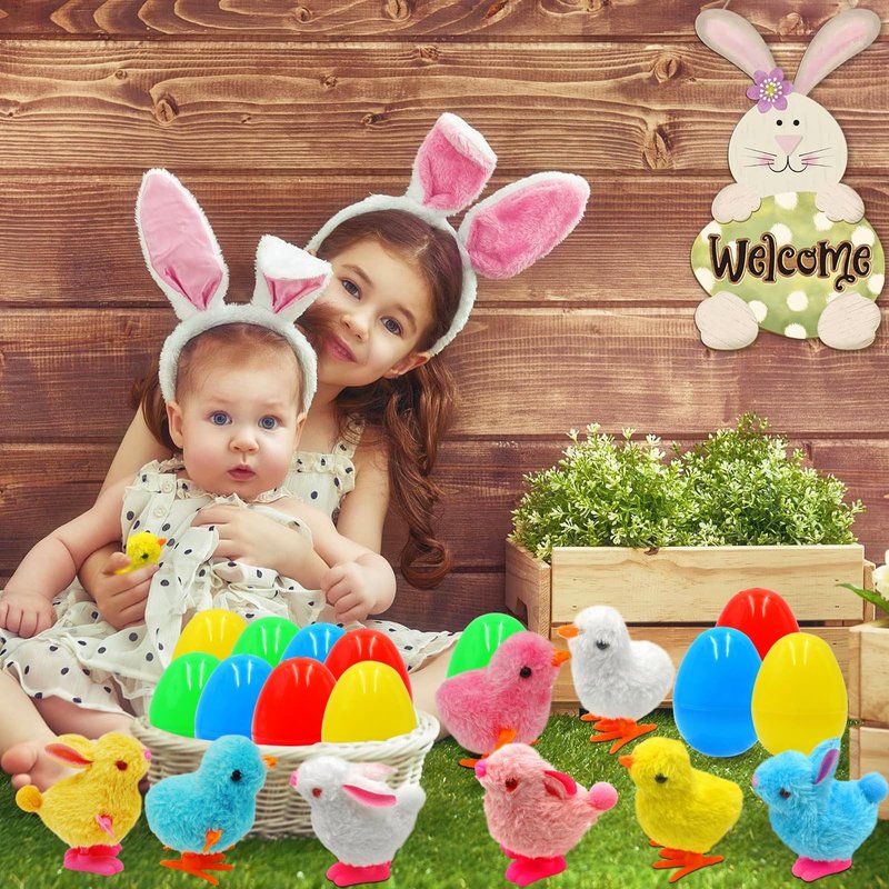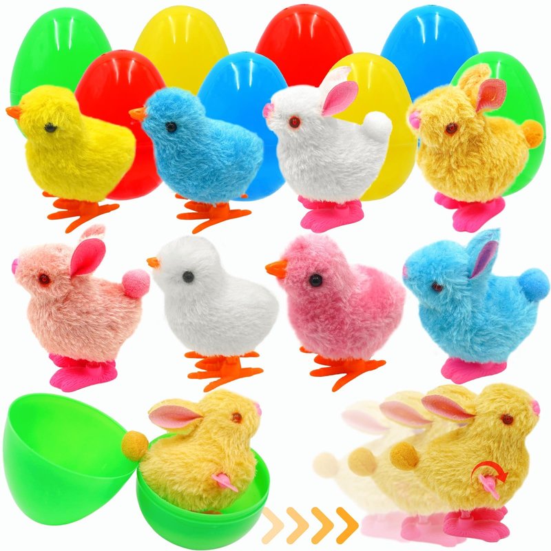 - 🌷【Super Jumbo Value Pack】Prefilled Jumbo Easter Eggs Set have 8 Colorful Easter eggs filled with 4 plush wind-up chicks and 4 bunnies, all neatly packed in a charming gift box.Perfect for Easter party favors and basket stuffers, these Easter eggs measure 3.9*2.9 inches each, promising endless joy and excitement!