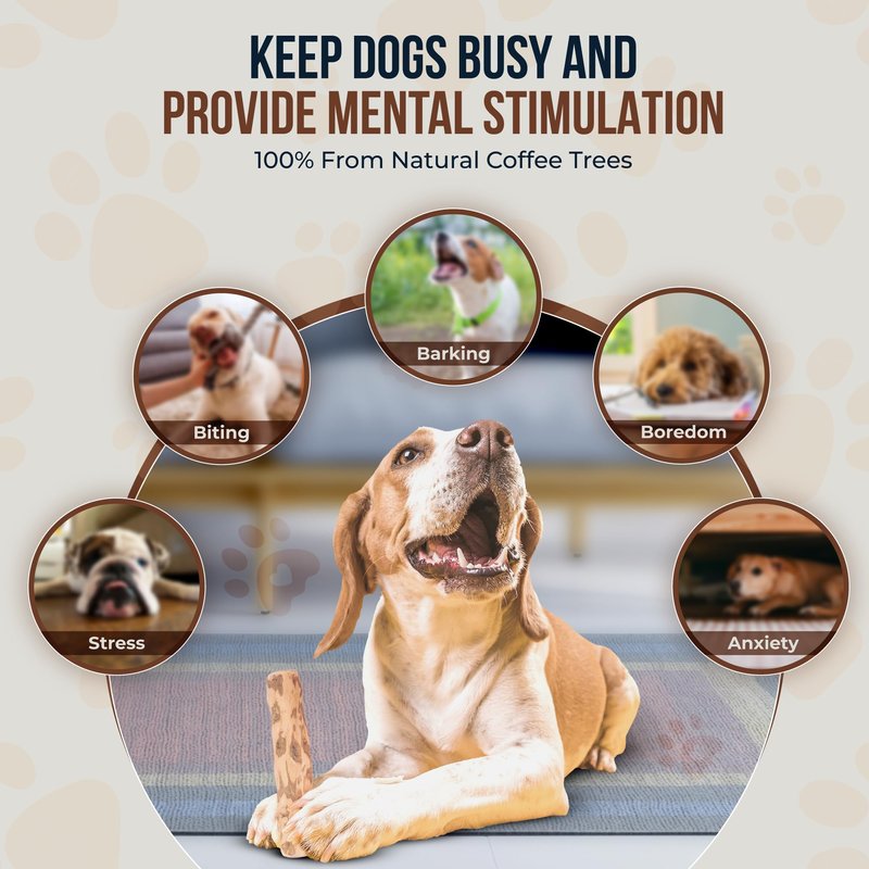 - SUPPORTS DENTAL HEALTH: Our coffee wood dog chew helps maintain dental hygiene by encouraging natural chewing behaviors. The chewing action can assist in the mechanical cleaning of teeth. As your dog chews, small fibers may be released, which can contribute to a dental floss-like effect. Regular chewing can promote strong jaw muscles and support overall dental health.