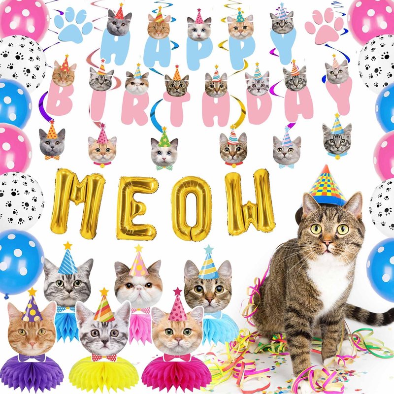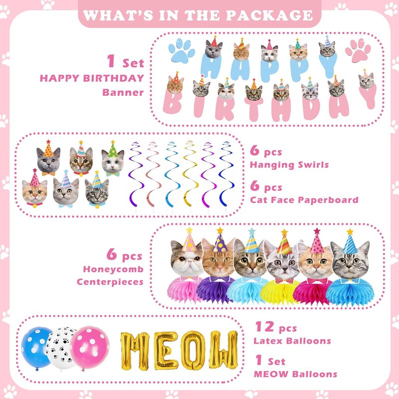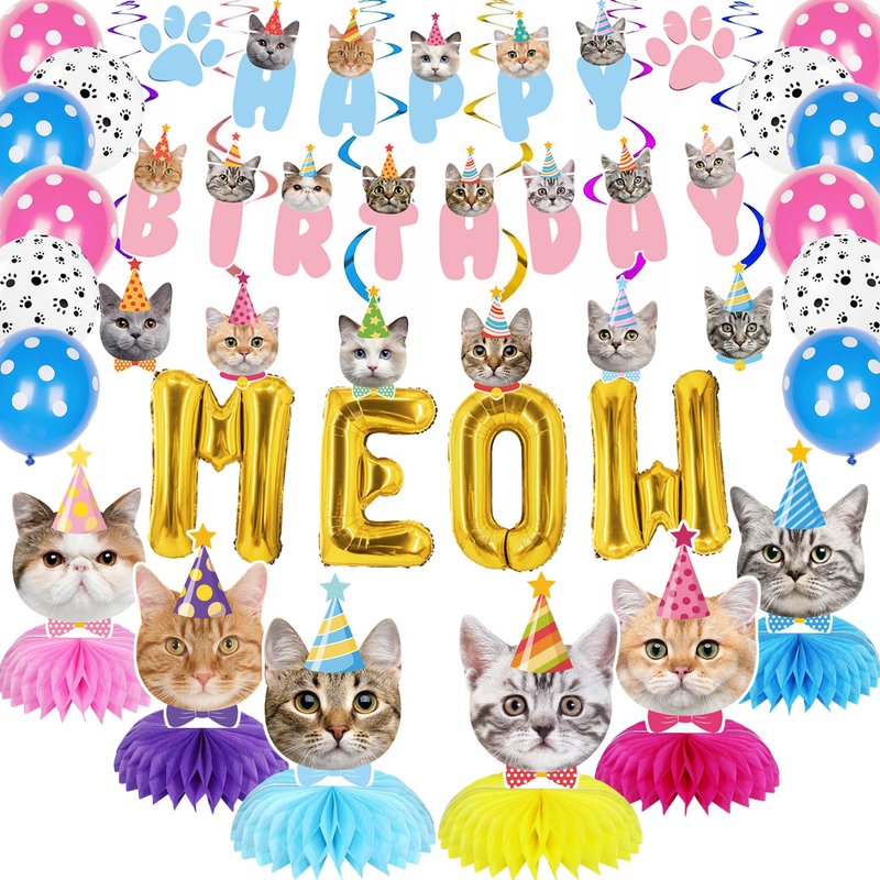 - Cat Birthday Party Supplies: These cat birthday decorations are enough to meet your needs for a special cat themed birthday party. You will receive: 1 blue and pink cat happy birthday banner, 6 cat honeycomb centerpieces in different colors, 6 hanging swirls with 6 cat cutouts decorations, 1 set of MEOW letter balloons and 12 cute balloons.